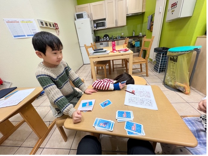 後半は、カードゲーム「OSHIYA(押し屋)TOKYO」を行いました。場の合計が21になるようにカードを出し合う中で、足し算や引き算、日本語での数の言い方を自然に学ぶことができます。どちらの活動も子どもたちから「もっとやらせて!」という声があがるほど好評で、算数を楽しむ時間となりました。