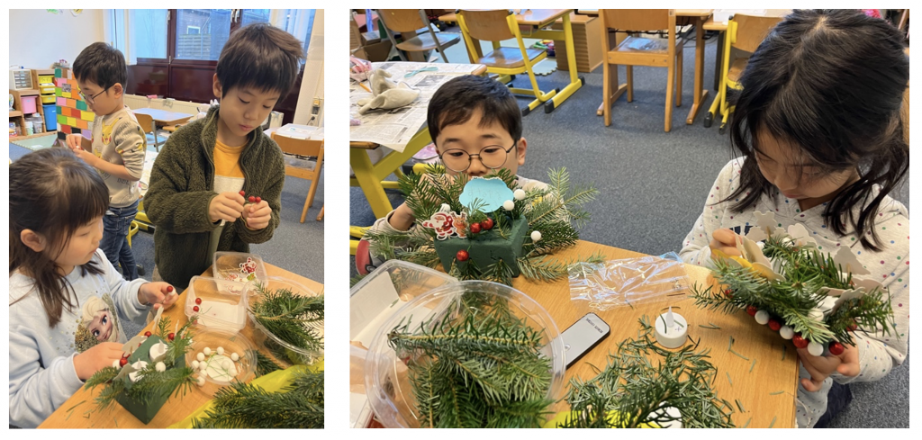 子どもたちは、モミの木をオアシスに差してから、赤や白の飾りやサンタの絵を差してそれぞれのアドベンツクランツを作りました。出来上がった作品は、学校の廊下に展示しています。