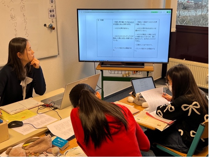 生徒たちは、妹の結婚式の場面、悪夢から覚めて再び走り出す描写、そして最後にメロスとセリヌンティウスが再会し、殴り合いながら友情を確かめ合う印象的な場面に注目しました。こうした場面から、二人の友情がどれほど深く力強いものとして描かれているかを読み取り、作品の魅力としてまとめることができました。文学を丁寧に読み解く姿勢が育まれた充実した授業でした。