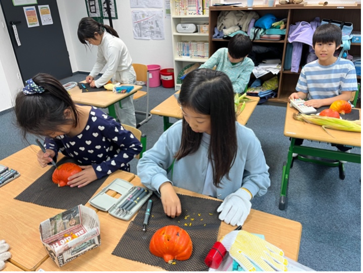 9月30日(火)、小学3・4年生の図工の時間に、ジャック・オー・ランタン作りを行いました。子どもたちはかぼちゃを半分に切り、中の種やわたをくり抜き、彫りやすく工夫しました。