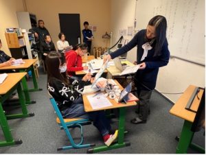 さらに、ドイツのジャガイモ料理として、ポメス(フライドポテト)、ベイクドポテト、ボイルドポテト、マッシュドポテト、カルトフェルザラート(ポテトサラダ)、クネーテル(ジャガイモや小麦粉を使った丸い団子料理)など多くの料理を、写真を使って分かりやすく紹介しました。みんなが親しみやすい内容だったので、質問もたくさん出ました。