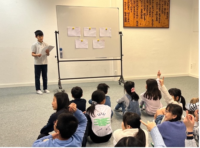 12月10日(水)のスピーチ朝会では、小学3年生が「ドイツの食べ物」について発表しました。国語の「すがたを変える食べ物」で学んだことをきっかけに、世界の食文化にも関心を広げ、ドイツの料理について調べたそうです。