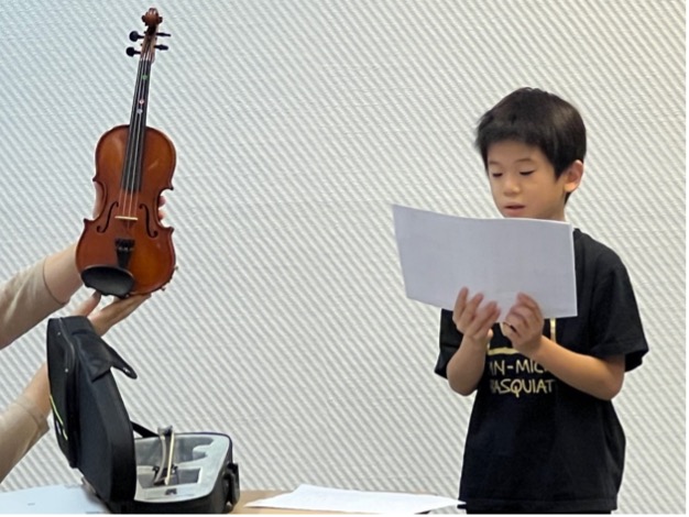 自分が持ってきたバイオリンを見せながら、バイオリンの演奏を見てかっこよかったので弾いてみたくなり、昨年から習い始めた経緯を話してくれました。また、バイオリンの作り方や仕組み、響きの美しさについても詳しく紹介しました。