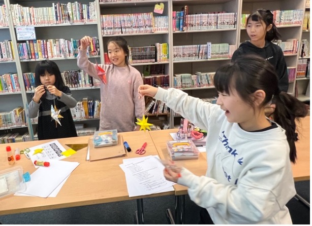 その後、ドイツ語の先生の指導のもと、折り紙を使って星と雪づくりに取り組みました。星づくりは、四つの光が出ている形を二つ作って組み合わせるもので、最初は難しく感じている様子でしたが、友だち同士で教え合いながら少しずつ完成させていきました。八つの光をもつ美しい星ができあがると、糸を通して飾れるようにしました。