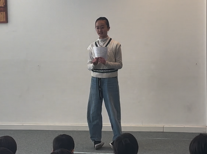 今日は全校朝会で、児童生徒会会長候補と副会長候補の選挙演説がありました。