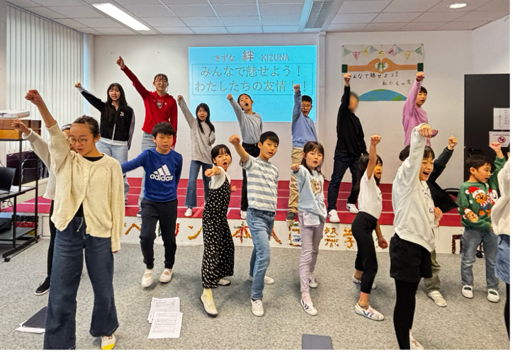 全員での合唱練習では、声だけでなく、手をつないで振ったり身体を左右に揺らしたりして喜びを表現しました。学校祭前日、子どもたちは緊張とわくわくした気持ちを胸に、心を一つにして練習に取り組んでいました。