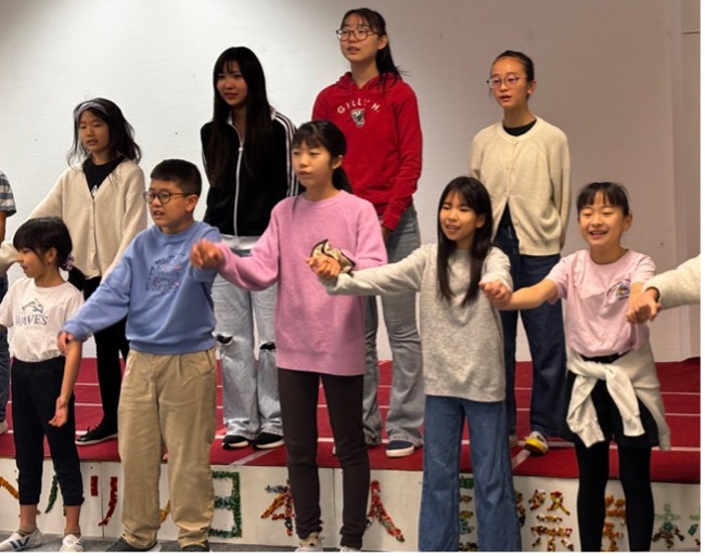 全員での合唱練習では、声だけでなく、手をつないで振ったり身体を左右に揺らしたりして喜びを表現しました。学校祭前日、子どもたちは緊張とわくわくした気持ちを胸に、心を一つにして練習に取り組んでいました。