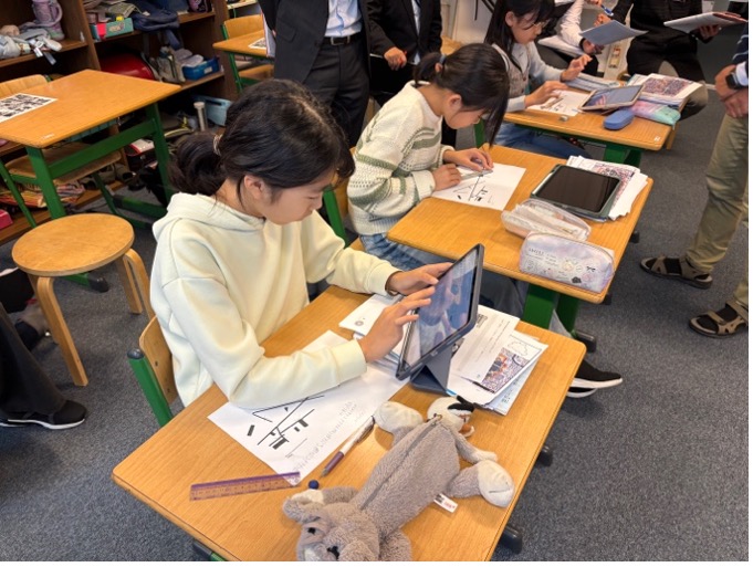 10月24日(金)6時間目に、小学6年生の算数で「およその面積」の研究授業がありました。ベルリンの大きな公園ティアーガルテンの森林部分の面積を、みんなで考えました。前日に全体の面積を調べていたので、今回は道や建物、池などを長方形や三角形と考え、それを引いて計算しました。