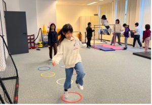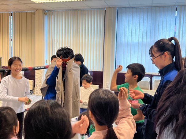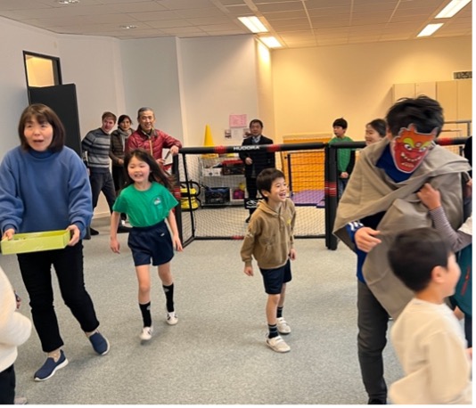 子どもたちは、豆の入った折り紙で作ったマスを手に、元気よく赤鬼に向かって豆を投げました。多目的室には、にぎやかな声が響き、みんなの勢いに赤鬼も驚いて退散しました。