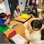 アプフェルクラスでは、トランプを使ったゲームに挑戦しました。手持ちの札を出しながら、その時点で場にあるカードの合計をドイツ語で言います。21を目指してカードを増やし、ぴったり21になるとカードをもらえるルールです。他の人が言うドイツ語の数をよく聞き、自分のカードと合わせた数をドイツ語で考えながら、一生懸命取り組んでいました。