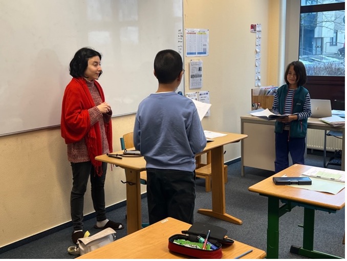 ビルネクラスでは、店員とお客のドイツ語でのやり取りを学びました。決まり文句や会話例を練習した後、ペアになってロールプレイを行い、服屋だけでなくさまざまなお店でのやり取りを実践しました。欲しい物や色、値段などをドイツ語で伝え合い、実際の生活場面を想像しながら会話を楽しんでいました。